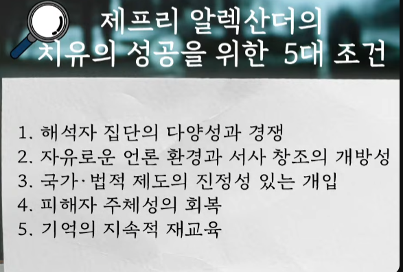 두 캡처는 서로 모순되는 것이 아니라 대응하는 쌍이다: 실패 목록은 “무엇이 결여되거나 왜곡될 때 치유가 막히는가”를, 성공 목록은 “무엇이 존재해야 치유가 가능해지는가”를 각각 서술한다. 표현 방식은 다르지만 내용적으로는 제프리 알렉산더의 문화적 트라우마 이론(전달자·공론장·서사·제도·교육의 결합)에 충실하다.